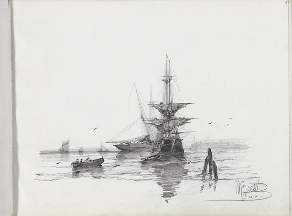 Albertus van Beest created this monochrome drawing of moored sailing ships using pen in ink in the mid-19th century. Note the subtle tonal range achieved through delicate washes of ink, creating a tranquil, almost ethereal atmosphere. The composition emphasizes the horizon line, dividing the paper into zones of water and sky. Van Beest uses linear perspective to create a sense of depth, guiding the eye from the foreground boats towards the distant ships. This arrangement isn't just about aesthetics; it reflects the period's interest in rationalizing space, mirroring the era's scientific and philosophical pursuits. Consider how the texture of the paper interacts with the ink, creating variations in tone and adding depth. It reminds us that artistic creation involves material processes as much as intellectual concepts. Appreciate how Van Beest transforms simple materials into a compelling exploration of space, light, and form.