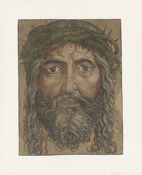 Curator: Let's turn our attention to "Das Schweißtuch der Veronika mit dem Antlitz Christi," or "The Veil of Veronica with the Face of Christ," an intriguing drawing crafted around 1804, presently held in the Städel Museum collection. The artist behind it is Clemens Aloys Hohwiesner. Editor: It's striking, isn’t it? The first thing that grabs me is the intensity of expression, rendered so precisely in what appears to be ink and pencil. It projects a sense of sorrow and profound suffering. Curator: Hohwiesner's skillful application of line weight and texture indeed contributes to the palpable sense of anguish. What’s also important to consider is the materials used. The choice of Indian ink on paper is significant. Indian ink allowed for these sharply defined contours, making visible not only the agony in Christ's face, but the artistic labour. Editor: Absolutely. And I’m drawn to the symbology here. The crown of thorns, of course, is an instantly recognizable symbol of Christ’s passion. The veil itself… it speaks to ideas of sacred relics and authentic likeness. This artwork taps into centuries of religious art tradition, of portraying Christ’s image, suggesting an almost spiritual, or historical authenticity. Curator: It certainly speaks to tradition, particularly the persistent visual language surrounding this image in the early 19th century. It really pushes us to think about the commodification of faith, right? How religious images were circulated and consumed by diverse audiences in Hohwiesner's time. Also think about paper production; who was afforded it? What value did the labor hold? Editor: I agree. This is not merely an aesthetic or artistic achievement; it functions as a cultural artifact imbued with layers of historical and religious meanings. Curator: Well, looking closer at this "Veil of Veronica," one has to consider its relationship to commerce as a signifier of social value, something Hohwiesner, intentionally or not, makes visible in this detailed work. Editor: Yes, contemplating on both the historical context and the use of iconography definitely enrich the understanding of its continuing influence. Curator: I agree, thinking about artistic labor as it functions within a specific context alongside this artwork and its cultural image, is essential to appreciate the depth of the art.