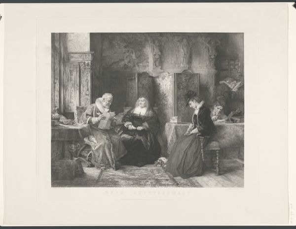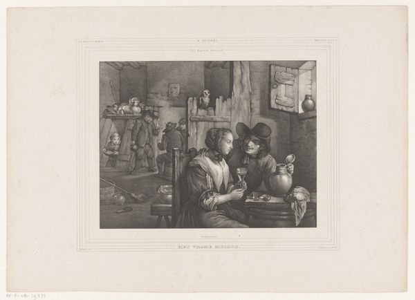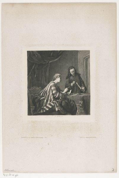 This print, titled "Interieur met moeder en zoon," was created by Hippolyte Prud'homme, who lived from 1793 to 1853. The image offers a peek into the domestic sphere, a subject often explored during a time when social roles were clearly defined. Notice the contrast between the mother, depicted with soft, gentle features, and the son, whose posture exudes a contemplative, perhaps restless energy. The map on the table between them hints at exploration and the world beyond their interior setting. Consider the implications of gender roles in the 19th century and how they might influence this family's dynamic. What does it mean to be a woman, confined to domestic space, versus a young man on the cusp of venturing out into the world? Prud'homme's work invites us to consider not only the sentimental aspects of family life but also the underlying tensions and aspirations of individuals within it. The image captures a moment in time, filled with unspoken desires and expectations.