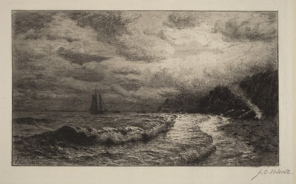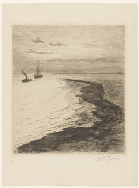 Curator: Looking at Carel Nicolaas Storm van 's-Gravesande’s “Schepen in de branding,” or "Ships in the Surf," created between 1887 and 1889, it’s hard not to immediately feel the power of nature. Editor: It’s very grey, isn't it? A turbulent sky and crashing waves dominate the composition, conveying a sense of foreboding, almost melancholy, despite the impressionistic style. I wonder about the process here. Curator: Storm van 's-Gravesande was deeply influenced by the Hague School and this etching reflects their interest in depicting everyday scenes, often emphasizing the relationship between humanity and its environment. Notice how the small ships appear fragile against the immensity of the sea. He presented often through the Hague Art Circle. Editor: Etching as a medium really lends itself to this subject matter. I imagine the artist carefully controlling the acid to achieve those nuanced shades of gray. What kind of press did he use? Did he print these himself? It is fascinating to think about the artist as both creator and producer. Was he influenced by developments in printmaking at the time? Curator: Absolutely. The late 19th century saw a boom in printmaking. Artists were experimenting and engaging with these techniques, though they also were still exhibiting paintings and participating in established salons, or becoming members in artist’s societies like Arti et Amicitiae. Prints allowed wider access to art, reaching new audiences, especially in burgeoning industrial cities. It was key to creating visibility for new trends in art. Editor: Yes, that's fascinating to me! We consider mass production, distribution, access and the very economics of art and culture. And the materiality, how the quality of paper impacts the impression of the scene itself… Curator: The etching perfectly captures the fleeting atmosphere, so characteristic of impressionism and landscape painting, though I think knowing that printmaking techniques can echo industrial manufacturing processes makes it extra poignant. Editor: I agree. These textures and light draw you in and suddenly make you consider how the image was made and for whom. Curator: Reflecting on "Schepen in de branding", one sees art's enduring dialogue with nature and technology, shaped by social trends. Editor: For me, it highlights how printmaking offers an insightful lens to understand not only artistic skill, but production and consumption and society.