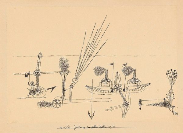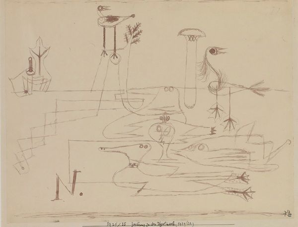 Editor: Here we have Lala Eve Rivol's "Petroglyph - Signs," created between 1935 and 1942, a drawing showcasing abstract figures reminiscent of ancient rock art. I’m really struck by the visual language employed and how the artist translated petroglyphs into this work on paper. How does a Materialist approach inform our understanding? Curator: Focusing on materiality allows us to consider how Rivol engages with Indigenous art. The drawing, with its linear quality, emphasizes a process. What sort of tools were employed here, and what of paper itself as an industrial commodity. The labor required for the entire lifecycle and how this labor intersects with Rivol’s project to reinterpret petroglyphs as commodity aesthetics. Editor: That’s a very interesting point, reframing something we view as “art” from the get-go to understanding how commodity production impacts the images' meaning. Curator: Absolutely. It challenges the boundaries of high art versus craft. The use of line also directs our focus to process and the relationship between her labor and the artistic traditions she invokes, bringing up questions of cultural appropriation and translation into capitalist production methods. Editor: So, considering that, are we viewing more so a "representation" of indigenous art through a colonial, economic lens? Curator: Precisely. And what does it mean to depict this subject using paper and drawing—how do these media mediate the ancient and industrial contexts, in turn reflecting or obscuring these petroglyphs? Consider what the drawing's potential consumption entails - gallery shows, publications. These processes fundamentally affect and redefine their original, physical context. Editor: I see, understanding that shifts everything. I didn't even stop to think how modern supplies such as paper, inform and affect meaning, here, or, even worse, dilute it. Thank you. Curator: A materials-based investigation urges that we reconsider these issues.