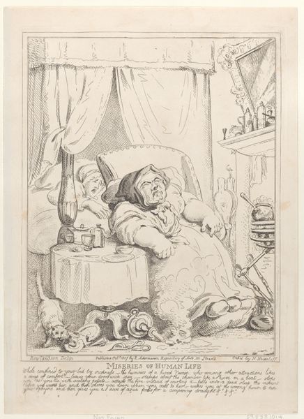 This etching by Nicolaus Heideloff illustrates the "Miseries of Human Life," presenting a scene dominated by the image of sickness and domestic chaos. Here, the central figure, an ailing woman, is surrounded by symbols of discomfort and disruption—a chamber pot, an overturned table, and a cat fighting with a rat. The motif of illness has echoed through art history, from medieval depictions of plague victims to Renaissance allegories of mortality. In Heideloff’s rendering, the sickbed becomes a stage for the drama of human frailty, reminiscent of similar scenes in Dutch genre paintings. The cat and rat fight beneath the table are significant as a metaphor for strife and disorder, mirroring the inner turmoil of the sick woman. Consider the visual language of despair—the slumped posture, the clenched face. These universal gestures transcend time, reappearing across cultures in various contexts, from religious depictions of suffering saints to contemporary portraits of anguish. These are all manifestations of a deep-seated fear and acknowledgment of our own vulnerability to the vagaries of life.