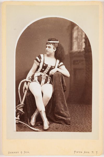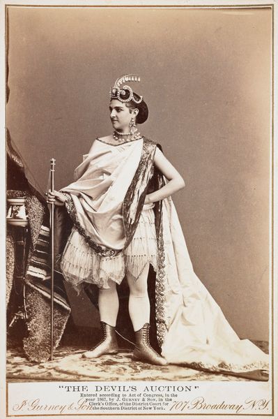Captured by Jeremiah Gurney in 1865, this photograph titled "The White Fawn" presents a theatrical composition rich in texture and carefully arranged elements. Sepia tones dominate, lending a sense of historical distance. The subject is a woman adorned in an elaborate costume, complete with fringed skirt, decorative bodice, and ornate headpiece. She stands holding a staff, her gaze directed slightly off-center. Gurney's manipulation of light and shadow accentuates the tactile qualities of her attire—the rough edges of the fringes and the sheen of the fabric. This emphasis on surface texture creates a dynamic interplay between visibility and concealment. Considered through the lens of semiotics, the photograph operates on a system of signs where each element—costume, pose, and props—contributes to the overall narrative. Yet, the narrative remains elusive. “The White Fawn” doesn't offer fixed meanings; instead, it invites viewers to engage in a dialogue with its intricate visual language and to question the constructed nature of identity and representation.