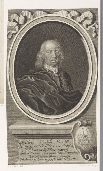 Curator: Here we have "Portret van Gottfried Stoesser" by Johann Martin Bernigeroth, dating from between 1703 and 1733. It's currently held at the Rijksmuseum, and it’s an engraving. Editor: Well, he looks like he means business, doesn't he? Stern but elegant, like a judge who secretly enjoys a good joke. I’m immediately struck by the precision of the lines, a sort of delicate intensity. Curator: Exactly. The line work speaks to a specific style and technique emblematic of the Baroque era—note the form, the shading. Portraits like this were integral to social and political power. How do you interpret the symbolism at play? Editor: Hmmm, the oval frame is interesting. It is not part of the actual picture and has been created with a very obvious thick dark black line that creates an image of a painting hung in a gallery in somebody's house. I’m curious about that odd sort of teardrop heraldic design at the bottom. Is it supposed to counterbalance the weight of the face? I feel like the heraldry maybe says "noble," while the subject says "intense concentration.” Curator: That heraldry is undoubtedly about situating Stoesser in the matrix of aristocracy. Notice also that inscribed text giving the vital information—who he was, what he was, the key aspects of his identity codified. Bernigeroth is not just making a portrait, he is making a claim. Editor: Makes you wonder about Gottfried Stoesser, doesn’t it? Was he really as serious as he appears, or did the engraver add a touch of drama? I’d like to think he had a mischievous side, just based on those wonderfully cascading curls. They seem ready for anything. Curator: It invites questions about representation, certainly. As does all portraiture from the period, considering not only individual agency, but how societal roles and constraints operate. Editor: Well, whatever the 'truth,' it's a powerful image, isn’t it? Almost photographic in its intensity, despite the older medium. Makes you feel like you’re actually looking at a person from a long time ago. Curator: Indeed, and I am pleased to contextualize the artwork further into historical frames and theoretical understanding. Thank you for your illuminating response to "Portret van Gottfried Stoesser". Editor: Likewise, and thank you for your sharp focus.