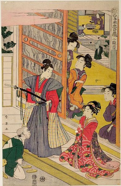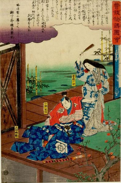 Curator: This woodblock print, "No. 25, from the series Magic Lantern Slides of That Romantic Purple Figure," is by Utagawa Kunisada. I see women here, by the shore, looking out on the ocean. There's a formal quality, yet something feels suspended. Editor: The figures seem almost theatrically posed. Given the title, I wonder if the “romantic purple figure” alludes to some idealized, absent male figure in their lives, perhaps a lover or husband. Curator: The "purple figure" is interesting; purple dye in Edo-period Japan was regulated and associated with status. These women are performing roles, constrained by class and gender. The ocean becomes a site of longing and expectation. Editor: Water often represents the unconscious, or the emotional body. In this setting, the ocean waves, depicted so distinctly, amplify the figures' emotions. It feels both beautiful and tragic. Curator: Yes, and there's an element of commodity here. "Magic Lantern Slides" points to a culture consumed by spectacle, even romance becomes a staged performance. Editor: Precisely. That the artist chose to highlight this play of identities speaks volumes about societal expectations. This tension is why the print remains so compelling.