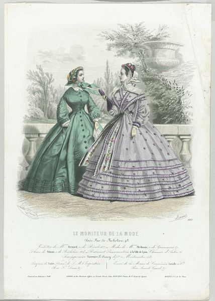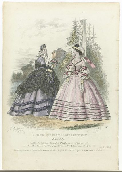 Jean-Baptiste Réville's "Le Moniteur de la Mode, 1861, No. 636" presents a chromolithograph that captures the fashions of its time through the careful arrangement of line and color. The composition is split between two figures, each displaying a distinct silhouette. The figure on the left with the blue and white dress, offers a checkered pattern, while the other on the right with the purple dress, exhibits bold geometric shapes. Réville employs a semiotic system where clothing functions as a signifier of social status and taste. The elaborate details in each dress, from the texture of the fabrics to the precision of the embellishments, speak to the era's cultural codes and values. The artist plays with structural oppositions - soft versus sharp, light versus dark- suggesting a subtle commentary on the constructed nature of beauty and the role of fashion in defining identity. The print doesn't just reflect fashion; it engages with the broader discourse on representation and perception.