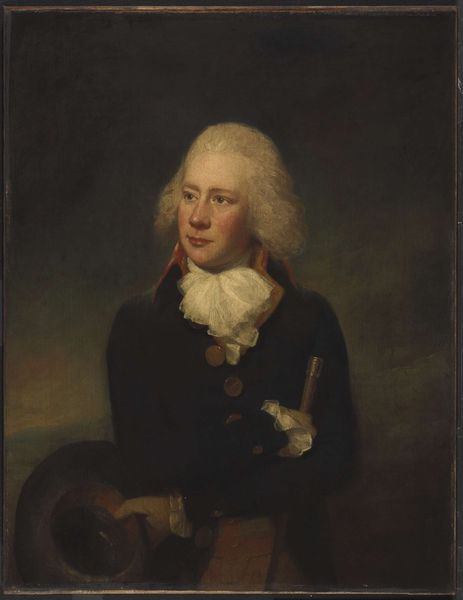 Curator: Gainsborough's portrait of Marie Jean Augustin Vestris, residing here at the Tate, is small but impactful, isn't it? Roughly 30 by 25 centimeters, oil on canvas. What are your first thoughts? Editor: A flash of powdered wigs and social posturing! He seems so self-aware, almost like he's performing his own portrait. Curator: Indeed. The theatricality of Vestris, a celebrated dancer, seeps into the portrait. Gainsborough captures him as a figure of spectacle, a star in his own right. Editor: The stark white of the frills draws the eye, doesn't it? White symbolizes purity, elegance, but here it feels performative, almost blinding. Curator: Perhaps a reflection of the stage lights, the intense gaze of the audience? It’s a study of celebrity, even then. Editor: I see the weight of reputation, the expectation to always be "on." A timeless dilemma, I'd say. Curator: Yes, a painted echo of the gilded cage.