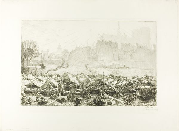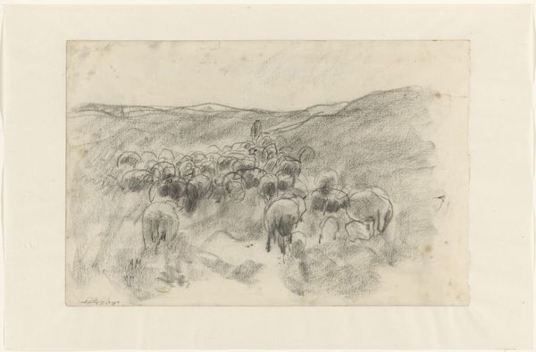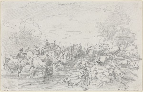 Jac van Looij created this sketch of an Arab market using graphite on paper. Graphite, a basic material, allows the artist to quickly capture a scene, focusing on the overall composition rather than precise details. Van Looij’s technique, with its quick strokes and tonal variations, conveys the bustling energy of the marketplace. The density of the graphite marks indicates areas of activity, such as the crowd behind the horses, while lighter strokes suggest the open sky. The choice of graphite on paper emphasizes the immediacy of the artist's observations, directly linking his hand to the scene. The sketch is evocative of 19th-century European Orientalism, and the perceived exoticism of other cultures. Van Looij captures a moment in time, highlighting the social and economic exchange of the market. Ultimately, the artist's focus on conveying the essence of the scene makes us reconsider the ways in which art making has often been contrasted with other forms of skilled production.
