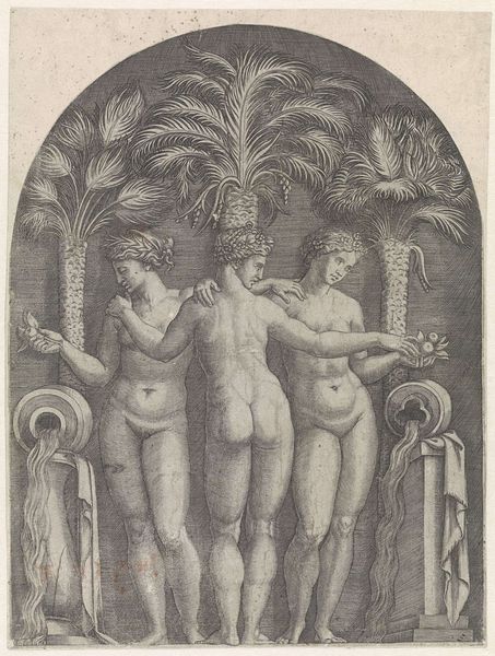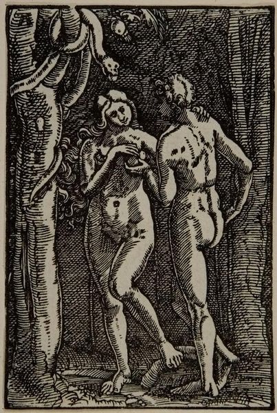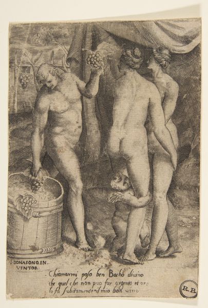 Curator: This striking print by Bernard Reder is entitled "Gargantua avec les trois graces - mais a \"chacune\" une pomme (a la R.)" dating circa 1942. It's an ink drawing, translated via the woodcut medium into stark black and white. My first impression is one of visual overload! It’s incredibly dynamic. The high contrast and densely packed figures create a real sense of… compaction. Editor: The woodcut itself lends an archaic quality, connecting the work to traditions of allegorical and moralistic printmaking. Note how Reder plays with classic themes of the Renaissance—nudes, grace, the figure of a giant—and subverts it with distorted, almost grotesque figuration. Curator: Yes, I think you’re right. There's this really strong thread connecting to, say, Cranach’s nudes, but it’s run through the wringer. The distortion feels very relevant, as a modern twist on classic form. But that Gargantua figure dominating the composition immediately triggers narratives around appetite, excess, maybe even abuse of power? The title explicitly brings in the myth of the three graces, which heightens the contrast. Are these classical ideals being offered apples? Or something else? Editor: It could also be interpreted as a comment on artistic creation itself, wouldn't you agree? The giant as a demiurge-figure commanding these forms into existence. And speaking to forms—the dynamism also pulls me in as this chaotic but structured aesthetic creates depth of field while playing with flattening effects, drawing upon cubism and early-twentieth-century painting. Curator: Fascinating perspective! To consider the art making itself, where this overwhelming scene may also hint at creative fertility as its main engine... I will never look at this woodcut the same way. Thank you for offering these interpretations, allowing us to rethink inherited visual traditions in response to the realities of the contemporary artworld. Editor: It's the materiality of the woodcut itself that draws me in, I appreciate its ability to highlight aesthetic structure. The interplay between tradition and revolution continues to resonate strongly with this art.