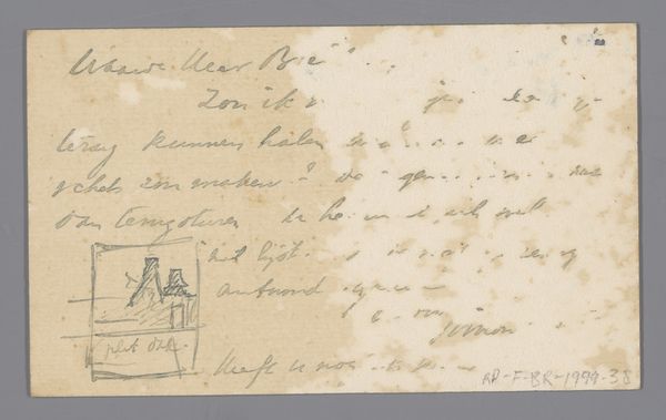 Editor: So, this is "Envelop aan Philip Zilcken" by Charles Hermans, dating from before 1883. It’s an ink drawing or print on paper, simply an envelope. I find the script beautiful. It makes me wonder about the sender, and its slightly distressed look gives it a real sense of history. What does this little piece say to you? Curator: Ah, it whispers tales of connection, doesn't it? I imagine Hermans, pen in hand, carefully crafting each word, knowing it would traverse miles, carrying thoughts and emotions. Notice how the ink bleeds ever so slightly into the paper—a beautiful imperfection. Does it perhaps suggest that even the most precisely crafted message is vulnerable to being changed or exposed? How does the notion of a private note becoming public resonate with you, especially knowing we are looking at it centuries later? Editor: That makes perfect sense. The idea of the letter being vulnerable is so relevant now. With digital communication, things can become public so easily, and I guess it was always that way on some level! Curator: Exactly! It’s a tangible link to a past where communication was slower, more deliberate. Now look at the address, "Java Street," it reminds us that this Hermans lived in a world increasingly connected through colonial activity. The handwriting itself almost becomes a portrait of the person, a kind of embodied performance captured in ink. Wouldn't you agree? Editor: Definitely, there is something intimate and revealing about handwriting, a time capsule! Thanks, that has opened up so much in thinking about what this represents, more than just an envelope! Curator: It's amazing how even something so small can contain a whole world, isn't it? These tiny objects from the past often resonate with thoughts about broader society.