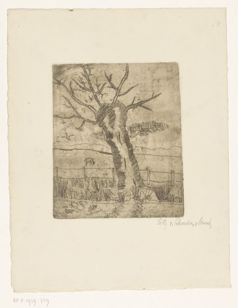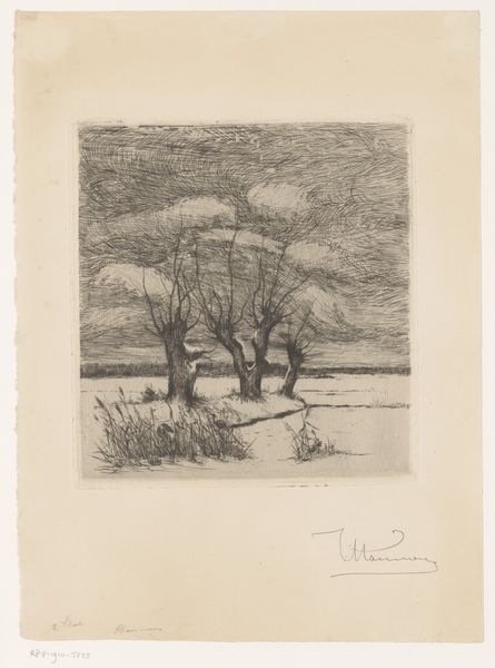 Theodoor Hannon made this etching titled 'Landscape with pollard willows and two birds in the reeds' at an unknown date. The imagery is steeped in the artistic traditions of the Netherlands, a country whose cultural identity is intertwined with its flat landscapes and waterways. Here, Hannon depicts a familiar scene: pollard willows, their branches pruned for practical use, standing against a low horizon. This humble motif, however, also speaks to the nation's economic backbone. Historically, willow branches were vital for basket weaving and reinforcing dikes, underscoring the constant human effort required to manage the land and waters. Hannon's dark, atmospheric rendering gives it a sense of intimacy. The birds nestled in the reeds add a touch of animation and a connection to the natural world, which would have been important at a time of increasing industrialization. Delving into the cultural context of the late 19th century through sources like agricultural records and local histories will give a deeper appreciation of the scene depicted in the artwork.