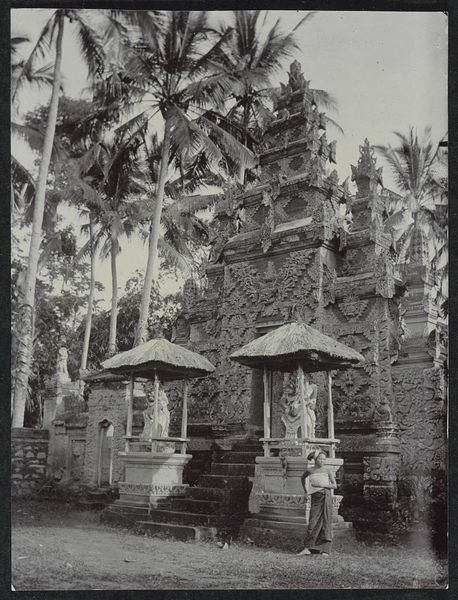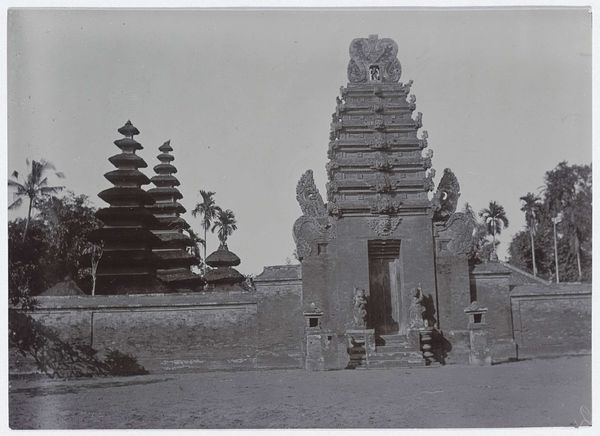 Curator: Immediately, the sheer density of carving strikes me; the tactile quality is overwhelming. Editor: Indeed. What we're looking at here is a photographic print, potentially tempera-enhanced, titled "Tempel in Bilabadjang, Bali, voormalig Nederlands-Indië," placing its creation roughly between 1890 and 1910 during the colonial period of the Dutch East Indies, as it was then known. Curator: So the image itself becomes part of that colonial project, documenting and, in a way, claiming ownership over Balinese culture through visual representation. The materiality of the print—the photographic paper, the potential addition of pigment— speaks to the means by which this 'exotic' scene was captured, processed, and disseminated back in Europe. It begs questions about the photographer's labor. Editor: And yet, what persists beyond the colonial lens is a powerful sense of spiritual presence. Consider the towering, pyramidal gateway, intricately carved with what appear to be protective deities and symbolic foliage. The stepped design directs the eye upwards, fostering a feeling of ascending towards the sacred. Curator: But what stories do the carvers' hands tell? Were they commissioned or conscripted, paid fairly or exploited? Who profits from this image? These questions must always accompany the aesthetic appreciation. What kind of access would they have to photography? The availability of material speaks to different audiences. Editor: I see layers upon layers of symbolism: figures perhaps drawn from Balinese Hindu cosmology meant to purify those who enter, transforming everyday experience into a sacred journey, maybe alluding to ancestral and natural veneration as a cultural narrative. The print becomes a palimpsest where those stories remain. Curator: But is "sacred journey" our interpretation, or theirs? The camera doesn't just record; it participates in shaping that perception. And the image, reproduced and circulated, becomes a commodity consumed within a colonial power dynamic. It shows me production in different layers. Editor: I concede the limitations of photographic documentation, but to me, it offers an echo of enduring Balinese cultural identity, communicated through enduring iconography and craftsmanship. I feel privileged for its preservation. Curator: Perhaps we find that by investigating its layers of materiality and the conditions that created that materiality we find ways of grappling with its past as an object and for Balinese people it endures now.