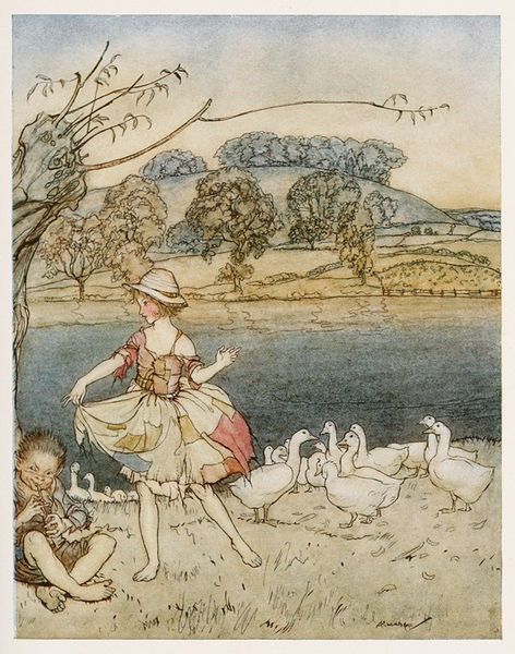 Editor: So, this is Arthur Rackham's "After this the birds said that they would help him no more in his mad enterprise," made in 1913. It looks like ink and watercolor on paper, and it has this otherworldly, almost haunting, quality. What jumps out at you about it? Curator: I immediately think about the availability of art materials, particularly paper and inks, at the time Rackham was working. Mass production enabled more widespread access, thus influencing the rise in illustration as a popular art form. This piece suggests a relationship between industrial capabilities and fantastical narrative. How does the seemingly delicate medium—watercolor—interact with what the title calls a “mad enterprise”? Editor: That's interesting... So you are seeing a connection between the availability of materials and the art being made? How does the medium's delicacy contrast with the 'mad enterprise'? Curator: Precisely. Consider the tension: We have relatively accessible and, perhaps, easily consumed materials in service of depicting a "mad enterprise," something inherently disruptive to a materialist sensibility. It provokes us to reflect on art's role in reflecting social and political anxieties through readily available, even banal, tools. What statement is being made, or at least suggested, about the purpose of creating a visual rendering? Editor: It sounds like Rackham might be making a commentary on the means of production themselves, or the nature of commercial illustration… The art relies on industrial processes, and perhaps it reveals something problematic in the availability or commodification. Curator: Exactly! And further, it hints at a democratization of artistic expression but does the artwork participate or comment on commodification? Editor: So, analyzing this piece reveals the interesting tensions between accessible materials, industrial processes, and artistic ambition. Curator: And the way artists respond and engage with those systems. Fascinating.