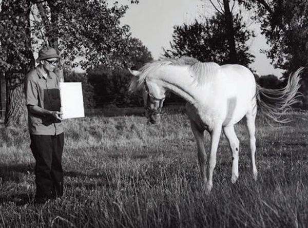 Editor: This is "Untitled (boys with horse)" by Lucian and Mary Brown. It's a black and white photograph that's reversed, almost like a film negative. It gives the scene a stark and surreal quality. What’s your take on this artwork? Curator: I see a complex interplay of production. The photographic process itself, the labor involved in capturing this image – the choices of film, exposure, and development – are all crucial. Consider the social context: what did owning a horse mean, and how did that affect the means of production? Editor: That's a great point; thinking about how it was made definitely changes how I view it. Thanks for the insight! Curator: And the photograph as an artifact. Where was it displayed? Who had access? How do those factors impact our experience of it today?