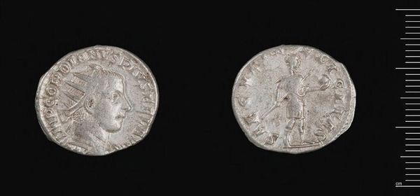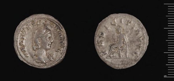 Curator: Here we have a Denarius of Septimius Severus, residing in the Harvard Art Museums. What are your first thoughts? Editor: Well, for something so small, it feels incredibly weighty. It’s like holding a tiny piece of an empire, worn smooth by time and touch. Curator: Indeed. Coins were powerful propaganda tools. This one presents a portrait of Septimius Severus, the emperor, projecting an image of strength and authority. Editor: And on the reverse, a figure stands with what looks like a cornucopia. Symbolism overload! This person is important, right? I wonder what their story is. Curator: Likely a personification of abundance, emphasizing prosperity under Severus' rule, or potentially a goddess, such as Pax, Concordia, or Felicitas. Editor: So it’s not just money, but a claim, a brand, a carefully constructed message hammered into metal. I get a sense of the emperor’s desire to assert his power. Curator: Precisely. And that desire echoes across millennia, reminding us that even the smallest objects can carry immense cultural weight. Editor: It definitely gives you pause, doesn't it? To think about all those hands this has passed through, all the transactions it witnessed. Pretty profound for pocket change.