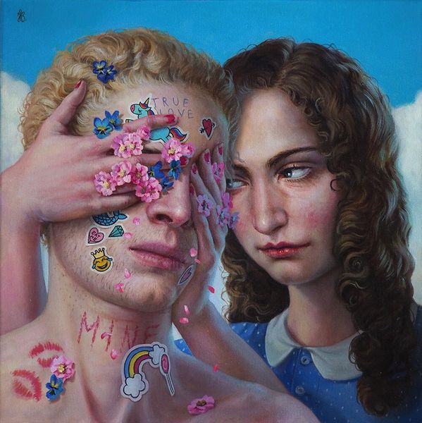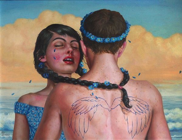 Curator: Jana Brike’s “kissing lessons behind the school shed,” painted in 2015 using acrylic on canvas, offers a compelling view of… well, what do you think when you see it? Editor: My first impression is one of transgression mixed with tenderness. It’s sensual and defiant. The sweetness of the floral crown juxtaposed against the almost aggressive advance creates a tension I find really compelling. Curator: Absolutely. This tension, in my view, is reflective of shifting cultural attitudes towards adolescent sexuality. The “school shed” setting implies a surreptitiousness, a hidden act, pointing to societal restrictions and moral codes around young people and their expressions of desire. Editor: Right. And let’s consider how these codes are often intensely gendered. The positioning of the figures, with one actively reaching and the other being touched, might be seen through the lens of power dynamics – perhaps mirroring or subverting stereotypical roles assigned to young women in particular. The butterflies almost act as witnesses. Curator: Witnesses, or perhaps symbols of transformation. The butterfly motif in art has often represented the soul or the journey of metamorphosis. In the context of a painting about first kisses, it resonates with the theme of personal discovery. As far as the medium is concerned, Jana Brike has long been recognized for these hyper realistic acrylic-painted pieces. The setting also evokes the Pre-Raphaelite era where art returned to nature. What is new in Jana Brike is this idea that first experiences of discovery happen in clandestine. Editor: I agree completely. The slightly naive neo-expressionist painting style lends the image an immediacy, a raw emotional vulnerability. You're really getting a sense of first time queer encounters being fraught with anxiety due to both self and societal acceptance. The intensity in their closed eyes, one protruding tongue against receptive lips, also points to the complex negotiation of agency. Who is leading? Who is consenting? Curator: Indeed. It prompts important conversations about consent, particularly in the context of queer female relationships where representations in mainstream media have historically been limited or stereotyped. Jana Brike allows queer children to come into themselves. Editor: Precisely. “Kissing lessons behind the school shed” becomes more than just a depiction of youthful intimacy. It's a powerful reflection on cultural anxieties, gender roles, and the ongoing quest for authentic representation in art. Curator: Thanks. This painting allows me to revisit queer art and how the intersectional narrative focusing on identity, gender, race, and politics keeps expanding over time. Editor: Yes. It's exciting to consider what these emerging visions of art will become over time as the world grapples with evolving definitions of beauty and expression.