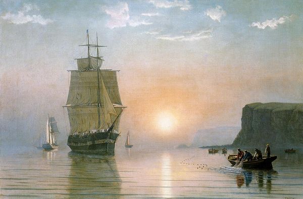 Curator: In William Bradford's 1881 oil painting, "An Arctic Scene", we see a ship bathed in golden light amidst icebergs. Editor: It’s quite beautiful! I'm immediately struck by the contrasting warmth of the sunset and the icy, cold environment. How would you interpret this work? Curator: For me, this painting is fascinating when we consider the social context of its production. Bradford was an American painter who made numerous trips to the Arctic, often funded by wealthy industrialists interested in exploiting the region's resources. Think about the labor involved – not just Bradford’s in creating the painting, but also the sailors, whalers, and indigenous guides he relied upon. Editor: That's a good point, one I hadn’t considered. Does the way the painting depicts the ship as central relate to that focus on resource exploitation? Curator: Absolutely. The ship represents a key element of industry and domination, disrupting the natural order. Look at the texture – how Bradford meticulously renders the sails, capturing their industrial weave, versus the more gestural depiction of the ice. It elevates human construction over natural phenomena. Editor: So, it's less about Romantic sublime and more about highlighting human industry's impact through the careful use of materials and process. The “romanticism” tag doesn’t seem as appropriate anymore! Curator: Precisely! Focusing on materiality allows us to move beyond a simple reading of beauty to consider the complex social and economic forces at play. Editor: This has completely shifted my perception. Thank you! Curator: And thank you, these fresh eyes have really underscored how potent material analysis can be in our understanding.