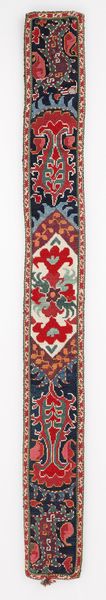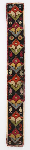 Editor: This is a decorative band for clothing from the late 19th century, housed here at the Minneapolis Institute of Art. It’s made from silk, cotton and other textiles using a weaving technique. I'm struck by the vibrancy and geometric nature of the pattern. What strikes you about it? Curator: I notice the strong interplay of the different colors. Consider how the artist utilized complementary colors, such as red and green, to create visual interest and balance. Editor: That makes sense. The repetition definitely creates a sort of rhythm, doesn't it? Curator: Precisely. The strategic deployment of repeating motifs contributes to the band's overall unity. Now, let us consider the shapes themselves. What geometric forms do you observe, and how do they interact? Editor: Well, I see stylized shapes within octagonal forms. And they’re positioned horizontally. The colors of those forms repeat across the length of the band in a pattern. Curator: An excellent observation! What affect does this create, specifically relating to the materiality? How do the visual elements come together to be materially significant to the experience of this artwork? Editor: Hmm...because of the repetition, you could cut the band at any point to embellish clothing without losing the core composition or visual element. You see how the composition gives rise to function? Curator: Precisely! That illustrates an understanding of the relationship between form and function. Editor: Thinking about this band in terms of pure structure really opens it up! Curator: Indeed. Shifting perspective to see its basic construction yields further appreciation.