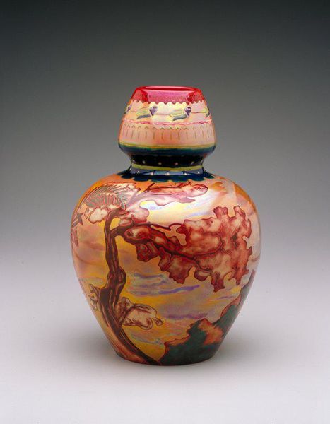 Curator: I find myself immediately drawn to its graceful form; the piece practically embodies tranquility. Editor: We're looking at "Ovale Vase mit Phlox, Nancy, Frankreich," a glass vase crafted around 1900 by Émile Gallé, a key figure in the Art Nouveau movement. Curator: The etched phlox blooms crawl up a rounded glass form and emphasize its surface, no? Their dark silhouettes sharply contrast against the amber color, making it extremely elegant. It gives the impression the vessel is covered in jewels. Editor: Yes, Galle's approach involves layering glass and then acid-etching the surface to reveal these floral designs. During this period in France, the Art Nouveau style signified a reaction against industrialization, with many artisans returning to the detailed handcrafting and natural motifs that became hallmarks of the movement. Curator: Note how the contours guide our gaze and enhance a sense of harmonic continuity. One might almost disregard that it is functional. In theory. The curve of its top especially—such an opening would highlight long stemmed flora, would it not? Editor: Art Nouveau really flourished in this exact intersection of craft, design, and the marketing of luxury items to an emerging bourgeoisie. Galle's designs were incredibly popular, contributing to Nancy, France becoming an important center for glass production. The vase signifies more than decorative beauty; it represents new aspirations in European society around the turn of the century. Curator: Yet in doing so, shouldn't we ask whether its beauty depends on us admiring its complexity? That decorative commitment, although not excessive, still suggests it wants us to believe in the value of skillful design for its own sake. And indeed, I do find this glass beautiful because of its delicate interplay of textures and shapes. Editor: Precisely; the vase, beyond being a beautiful object, embodies a complex historical and societal context. The object itself manifests political aspirations through aesthetic expression. Curator: The discussion surrounding it provides another view onto history, highlighting questions of artistic value and interpretation, not only the time it depicts. Editor: Indeed. Reflecting on the intersection of form and context allows for an insightful experience.