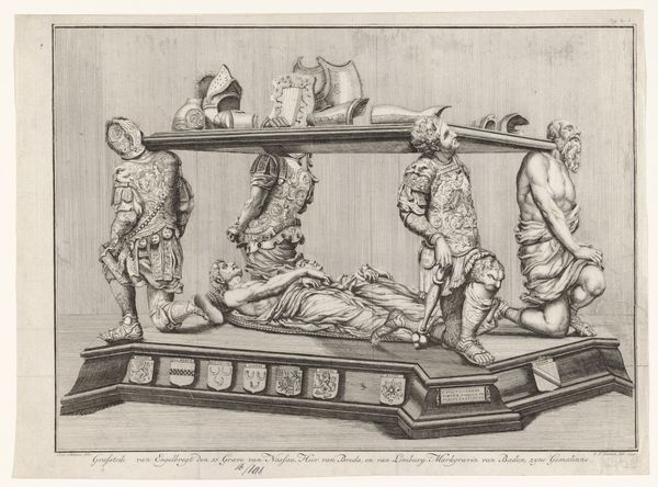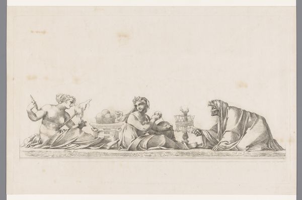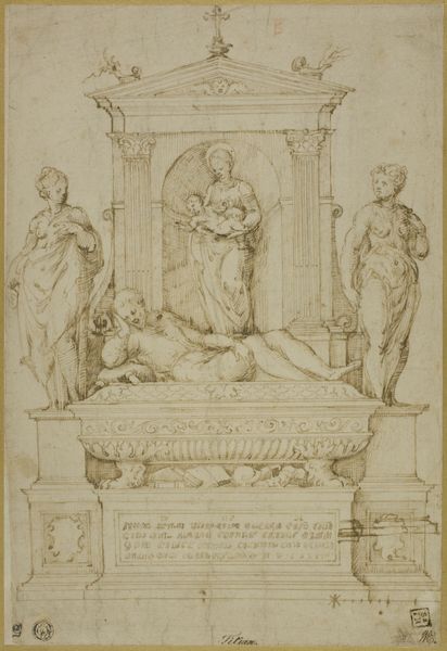 Curator: Hans Krumpper's "Allegory of Geometry," dating roughly from 1570 to 1643, presents a fascinating look into Renaissance ideals of knowledge. It’s currently held at the Metropolitan Museum of Art. Editor: It feels like a carefully staged drama, but everything's rendered with such precision in graphite on paper, you really see the labor involved. It also shows us the understructure or potential blueprints, if you will, for some sculpture or an architectural construction, don’t you think? Curator: Absolutely. We have a classical female figure representing Geometry, reclining with a globe. The globe grounds the universal idea of geometry to, essentially, earth-work and geographic space. She's accompanied by a cherubic figure using drafting tools. Editor: Note the visual emphasis here on the globe, its positioning right behind the nude figure, practically hugging it. Its shaded form, as well as other graphic flourishes throughout the drawing, make me wonder how many assistants were employed at his workshop? Or, even whether this might have been sketched for practice and sale as one of many similar drawings? Curator: It certainly raises the question of artistic labor. The presence of the cherub could symbolize inspiration and the transmission of knowledge, maybe a subtle statement of divine sanction? Throughout the Renaissance, the use of classical figures served as symbols of enduring knowledge, lending an aura of timelessness to intellectual pursuits. Editor: True, this aesthetic and composition is designed for conveying permanence. Also interesting that geometry, for Krumpper, is both a theoretical system and embodied practice—in its physical realization, something quite separate and less permanent from the timeless "knowledge" you are hinting at. What about that smaller sketch in the corner over on the side. It appears as a discrete ornament or elevation, doesn’t it? Curator: That certainly feels like a design element to be inserted into a larger work. This really does provide insights into Krumpper’s artistic and intellectual process. Editor: Exactly. We’ve peered into the artistic processes and the materials involved in conveying these weighty concepts through sculpture and architecture.