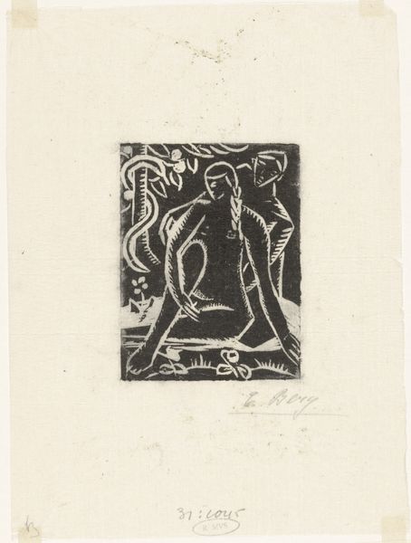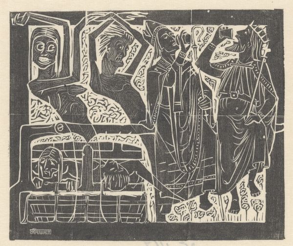 Curator: Let's discuss "Drie vrouwen," or "Three Women," a striking woodcut created by Else Berg before 1931. Editor: Immediately, the bold, contrasting black and white grabs you. The stark lines, the very simplified forms—it's all incredibly graphic. Curator: Berg was deeply engaged with expressionism. This print exemplifies that. Consider the societal constraints on women at the time and how Berg boldly portrays female nudes—three of them, confident and without shame. What do you make of that semiotic defiance? Editor: True, the simplified forms carry power, but to my eye the graphic treatment almost flattens the figures. The use of negative space is quite dynamic, creating a sort of visual push and pull. It becomes almost abstract if you focus on the voids as shapes. Curator: Indeed, that dynamic tension you point out serves to underscore the women's unified strength, an allusion, perhaps, to the burgeoning feminist movement in Europe during this era. Are these figures individuals or a representation of sisterhood and solidarity against patriarchal structures? Editor: Interesting. While that’s a very valid interpretation, one could also analyze the forms in themselves. The geometry is key here. See how the figures are assembled—the stark planes of the faces and limbs—it speaks to a Cubist influence as well, even within this expressionist idiom. The linear quality overall, while reduced, creates dynamic vectors between the figures and within the total design. Curator: Berg's work invites a multi-faceted understanding of the intersections between her artistic vision and her own experiences. As a Jewish woman artist during a tumultuous era, she offers us an undeniably progressive image, in the content and the mode of figuration, especially. Editor: Ultimately, for me, it's the composition—the artist’s clever manipulation of mass and void, light and shadow—that leaves the strongest impression. It presents the figures as unified in spite of simplification. Curator: So, from historical narrative to formal design, this work offers an opportunity to ponder the female experience across the early 20th century. Editor: An enduring example of the visual and thematic power of stark artistic economy.