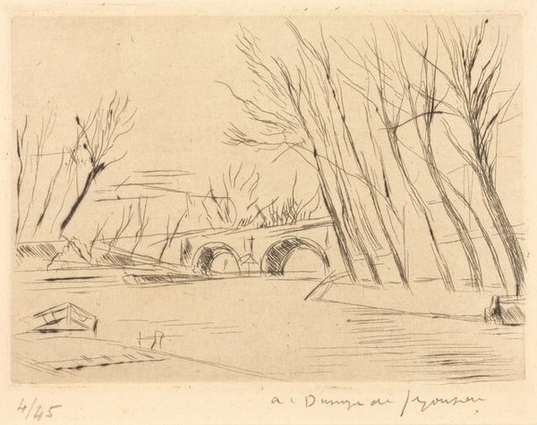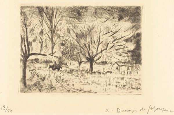 Editor: Here we have "The Mill at Serbonne," an etching created by Andre Dunoyer de Segonzac in 1923. There's something melancholic about the scene; it almost feels like a faded memory, or maybe a scene from a dream. What stands out to you in this work? Curator: Melancholy… yes, a subtle melancholy. Segonzac captures that perfectly. I think it comes from the starkness of the winter tree and the solitary figure walking towards the mill. For me, this piece sings with the artist’s inner life projected onto the landscape. He uses the etching needle like a seismograph to record not just what's visible but how he *feels* about what's visible. What do you make of the relationship between the natural and the built environment? Editor: It’s like they're both slowly dissolving into each other. The lines of the mill are so similar to the lines of the trees, as if nature is reclaiming the man-made structure. The etching captures a transient moment, right? Curator: Exactly. There's a profound dialogue between transience and permanence at play. Etching itself is interesting here: an act of both preservation (printing multiples of a scene) and recognition of the passage of time and inevitable change. It makes me wonder what the artist found so worthy of memorializing, so vulnerable, in this quiet scene. What lingers with you? Editor: Definitely the sense of solitude, but also the enduring presence of the landscape. It’s a powerful combination. Thanks for that amazing perspective! Curator: And thank *you* for pointing out the dissolving boundaries – it's sparked a whole new appreciation for Segonzac's poetic touch.