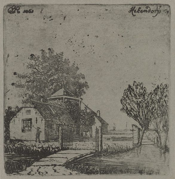 This is "Vervallen Huis," or "Derelict House," an etching made by Eberhard Cornelis Rahms. The image is a close study of a humble dwelling, likely somewhere in the Dutch countryside. The textures are carefully rendered; the thatched roof seems almost palpable. But the dominant element here is the tree, which looms over the house, its trunk heavily shadowed. Etching is an intaglio printmaking technique, where lines are incised into a metal plate using acid. It is a process demanding patience and precision, a world away from the scene depicted. Rahms chose etching to represent a scene of rural decay. Through labor-intensive mark-making, we are invited to reflect on the relationship between humans and their environment, and between the value we assign to labor and the inevitable forces of entropy. The dilapidated structure, the tree which dwarfs it, and the technique with which it was made combine, forcing the viewer to consider the social and economic issues of the time, as well as the place of craft within it.