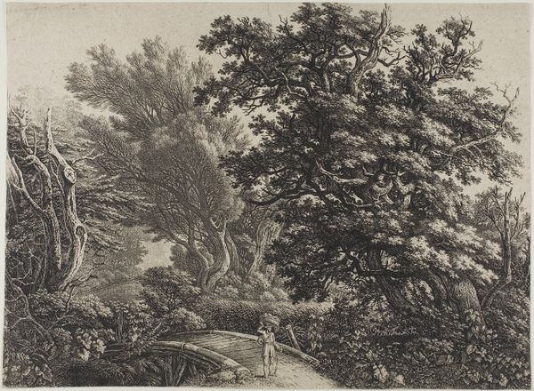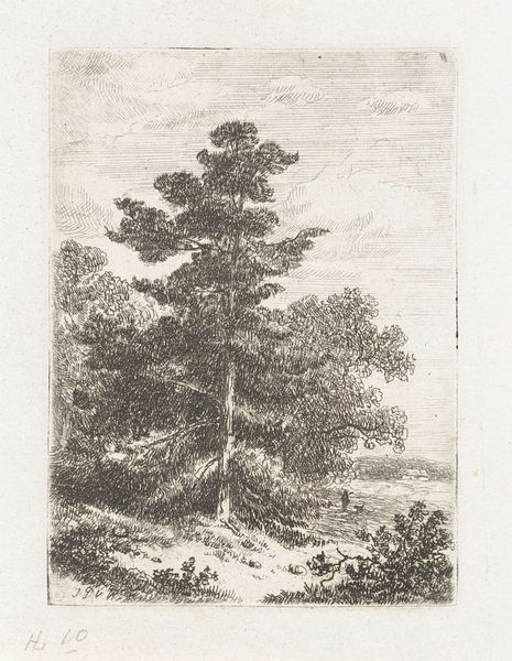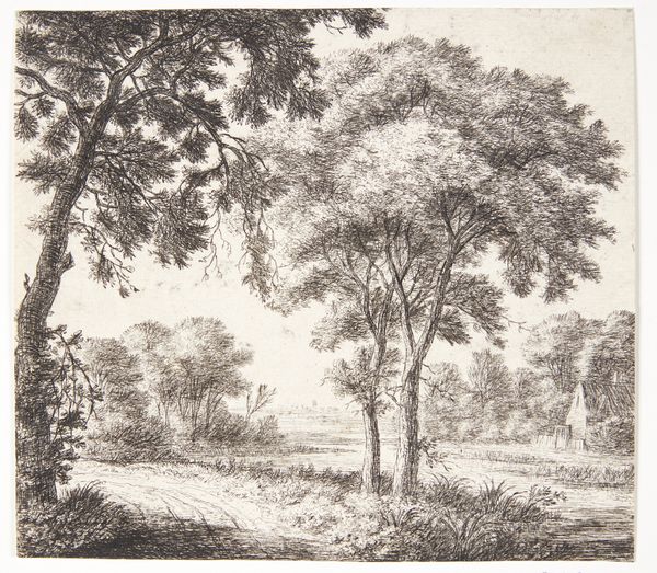 Editor: We’re looking at Jacob van Ruisdael’s “Cottage at the Top of a Hill,” created around 1660. It's an etching in ink on paper. The scene feels almost claustrophobic, like nature is slowly reclaiming this little cottage. What's your take on this work? Curator: This etching speaks volumes about land ownership and social structures in 17th-century Holland. While seemingly a simple landscape, it reflects the power dynamics at play. Ruisdael, though celebrated, often subtly critiques the Dutch Golden Age's economic disparity. How does the cottage's position, almost overwhelmed by the trees, speak to ideas of marginalization or resilience to you? Editor: I hadn't considered it in that context. I just thought the composition was interesting, with the cottage almost hidden. But what you are saying makes me rethink what is going on. Is it just about a picturesque scene, or is there more? Curator: Exactly! Consider the economic boom of the era. The etching shows how wealth concentrated in urban centers, and marginalized rural populations. It invites us to consider the cottage not just as a building but as a symbol. Do you see how Ruisdael, through technique and perspective, situates this cottage within a larger conversation about access and visibility? Editor: Yes, the detail in the trees and the almost careless strokes showing the cottage seems to emphasize that. Almost like he sees the cottage as secondary to nature. Thanks for your perspective, it really changes how I see it. Curator: It is crucial that we continuously contextualize art. This piece now can serve as a conversation about displacement caused by gentrification that persists in society.