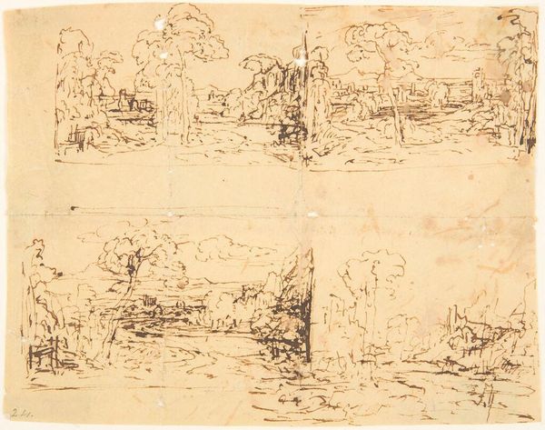 Editor: We’re looking at "Rest with the Guard" by Rodolphe Bresdin. It’s a pen and ink drawing of indeterminate date housed here at the Art Institute of Chicago. I am struck by the frenetic energy of the line work; despite the title, there’s not a feeling of repose at all. How do you interpret this work through a formalist lens? Curator: Let’s observe how the composition guides our eye. The artist juxtaposes areas of intricate detail with open space. Consider the stark contrast between the densely rendered figures and the thinly sketched background elements. The pen strokes, seemingly chaotic at first glance, upon closer inspection, create a visual rhythm and tonal range, contributing to a sense of depth. Editor: I see what you mean. The background figures on the left look monumental while at the same time so linear, they could disappear with a strong wind! Curator: Precisely. Observe how Bresdin uses hatching and cross-hatching to define form and shadow. What effect does this have on the overall impression of the piece? Note that the formal analysis hinges upon close attention to visual properties and how they work together. Editor: The chaotic linework almost blurs boundaries – reality vs. fantasy? Curator: Indeed, the technique obscures distinctions between objects that a conventional mode of rendering might’ve more explicitly coded in terms of “foreground” vs. “background”, or “important” versus “supplemental”. Editor: So the content is secondary to the technique? It’s less about who the guards are and more about *how* Bresdin portrayed them? Curator: To an extent, yes. For a formalist, the aesthetic impact emerges from how the artwork is constructed. But that doesn't erase content or context. In fact, close examination can allow viewers to discover and better understand those ideas through this piece, too. Editor: Interesting. I guess looking at it that way frees me to notice details I otherwise wouldn't. Thanks for the new perspective. Curator: My pleasure. Thinking closely about line, tone and space yields new appreciation every time.