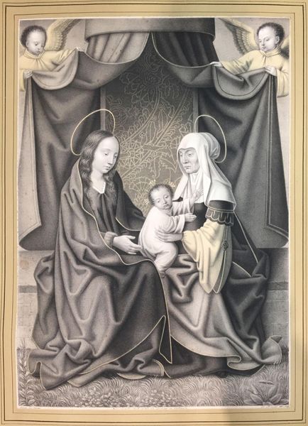 Curator: Johann Nepomuk Strixner's "Madonna Enthroned" presents a formal, almost regal, depiction of the Virgin Mary. Editor: It’s incredibly still, isn’t it? Like a perfectly arranged stage set before the play begins. And those expressions…intensely serene. Curator: The mirroring of figures in the background and foreground lends it a timeless, dreamlike quality. Look at the symbolism: the open book, the offering of fruit, the delicate basket of eggs. Editor: I'm especially drawn to the book; an emblem of knowledge and wisdom right in the foreground. It feels like the artist asks us to read the image itself. Curator: Precisely. Images as carriers of memory, offering echoes of tradition, belief, and even a subtle yearning for a different world. Editor: Absolutely, a world steeped in symbolism. It's amazing how even a seemingly simple composition can whisper so many stories.