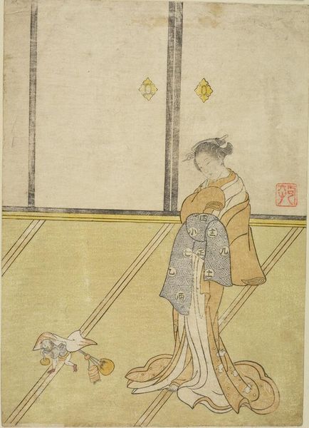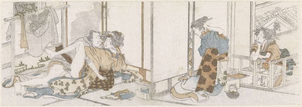 Curator: Here we have Katsushika Hokusai’s woodblock print, "Scene in May: The Boys' Festival." Editor: It feels like a tranquil glimpse into a private world, framed by domestic architecture. The colors are so soft, muted. Curator: Indeed. Hokusai masterfully divides the composition, juxtaposing interior and exterior spaces. Note how the figures are arranged to guide the viewer’s eye. Editor: The eye follows that gentle curve from the standing figure down to the children indoors. There's a sense of contained energy, as if something is about to happen. I wonder about the narrative. Curator: It invites us to consider the relationship between private and public life within the context of the Boys' Festival. The meticulous linework contributes to the overall harmony. Editor: It's incredible how such delicacy can convey so much depth and emotion. A lovely, subtle piece.