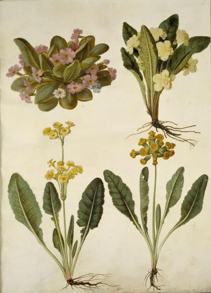 Curator: This piece presents us with a question mark right in its title: "Primula ×polyantha (?); Primula veris (?)" made with watercolor and gouache sometime between 1635 and 1664, and attributed to Hans Simon Holtzbecker. The artwork presents three seemingly different species of primula against an off-white backdrop. Editor: Ah, so Holtzbecker was hedging his bets, huh? Question marks included. I’d say my first impression is that they look… cheerful. In a slightly melancholic way. You know, like a sunny day tinged with the knowledge that autumn is coming? Curator: That's a very evocative way to put it! What's interesting here is how Holtzbecker’s precision is itself a cultural artifact, reflecting a broader impulse in 17th-century science to classify and organize the natural world. How does this impulse intersect with the rise of colonialism and the exploitation of resources? Editor: You've sent my head spinning to far flung places with this botanical piece... Seriously, though, I guess it’s the way he’s so meticulous, it reminds you that someone actually took the time to really *look* at these flowers. Which, in our crazy world, is kinda radical. Like, stop, smell the roses, and really *see* them, you know? Before we lose them. Curator: Exactly. This representation speaks to a desire for control and knowledge, but also a very genuine appreciation. And consider, for a moment, the perspective of the botanical artist at the time. What role might women have played, for example, in either the cultivation of specimens or artistic patronage, given prevailing gender norms that privileged them with overseeing domestic spaces and cultivating gardens? Editor: Yeah, makes you wonder about all the hidden stories behind these "simple" depictions. If the image could talk... Curator: Well, maybe this detailed drawing already *is* a way of talking. Consider it within the history of science, for instance; how might this artwork be speaking about our contemporary ecological crises and inspire dialogue and actions around preserving biodiversity? Editor: True. There is a lot going on beneath the surface if you take the time to explore the many layers to this picture. Curator: Indeed, these historical depictions of flora invite us to consider the complex relationships between art, science, power, and the natural world, reminding us that even seemingly simple images carry profound cultural weight. Editor: And sometimes, simply a deep love of bright yellow flowers, and maybe even, I’d argue, hope! A little reminder of beauty when you really, really need it.