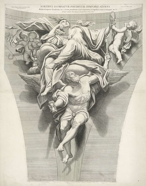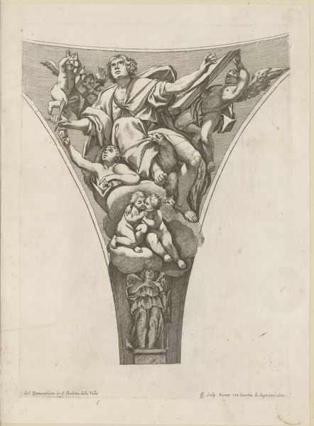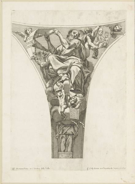 Stephan Colbenschlag created this engraving of Mattheus the Apostle in the 17th century. The composition, primarily linear, emphasizes form through the density and direction of etched lines, which gives the figures volume and weight. Notice the dramatic rendering of Saint Matthew surrounded by angels. The artwork is structured around a semiotic system. Matthew’s pensive expression, paired with the presence of angels bearing symbolic objects, such as the book and stylus, indicates divine inspiration and authority. The line work creates depth, and the strategic placement of light and shadow directs the viewer's eye, encouraging us to decode the visual narrative. The use of hatching and cross-hatching reflects a broader artistic interest in representing three-dimensionality on a two-dimensional surface. Consider how the formal qualities of line and composition interact with the religious subject matter. The strategic use of these elements evokes contemplation and invites a deeper engagement with its spiritual themes.