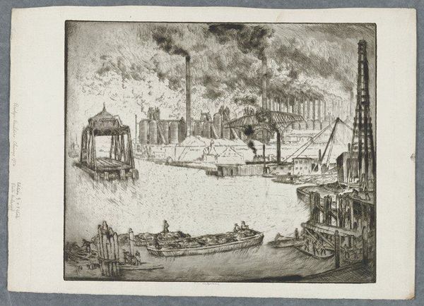 Otto August Kühler made this etching, titled 'The Valley of Work', in the United States. Here, the artist shows us a landscape dominated by industry. The scene creates meaning through its depiction of factories belching smoke, a river crowded with boats, and a general sense of bustling, and perhaps overwhelming, activity. This image evokes the early 20th century, a time when American cities were rapidly industrializing. The country's economic structures transformed as factories drew workers from rural areas, and its political movements grappled with questions of labor rights and environmental regulation. Kühler here doesn't adopt a straightforwardly conservative or progressive stance. Instead, it prompts us to consider both the benefits and costs of industrial progress. To understand the artwork better, we might research the history of industrialization in the US, looking at photographs, newspapers, and other primary sources from the time. We can then reflect on the meaning of art as something that is contingent on this social and institutional context.