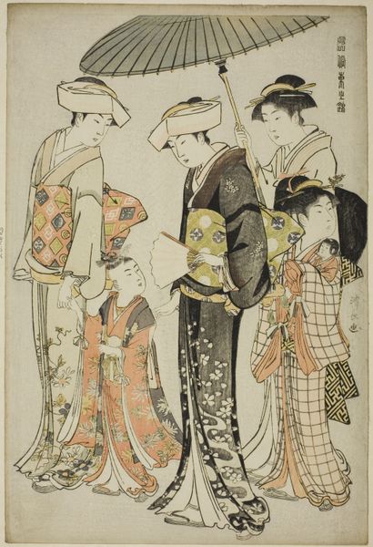 Torii Kiyonaga created this woodblock print of women and a child around the late 18th century. What strikes you first is the rhythmic arrangement of the figures, their forms gracefully elongated. This focus on line and shape organizes the composition. The women are dressed in summer kimonos, their patterns adding a layer of complexity, yet the color palette remains subdued, creating a sense of harmony and balance. Note how the figures create a flattened picture plane. Kiyonaga uses a restricted range of colors and precise lines which results in a formal elegance that transcends mere representation. Consider also the semiotic implications of the parasol, a signifier of protection, and the women's attire, which speaks to social status and adherence to cultural norms. This print invites us to consider not just what is depicted but how it is depicted, revealing the artist’s sophisticated understanding of form, structure, and cultural codes. The artwork encourages us to think about the relationships between signs and meanings.