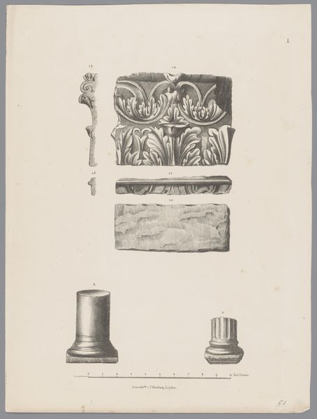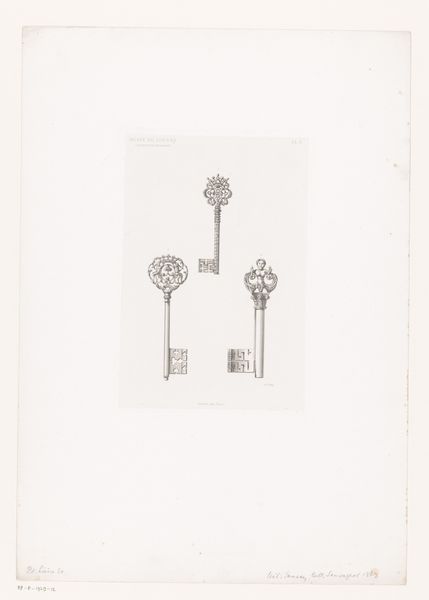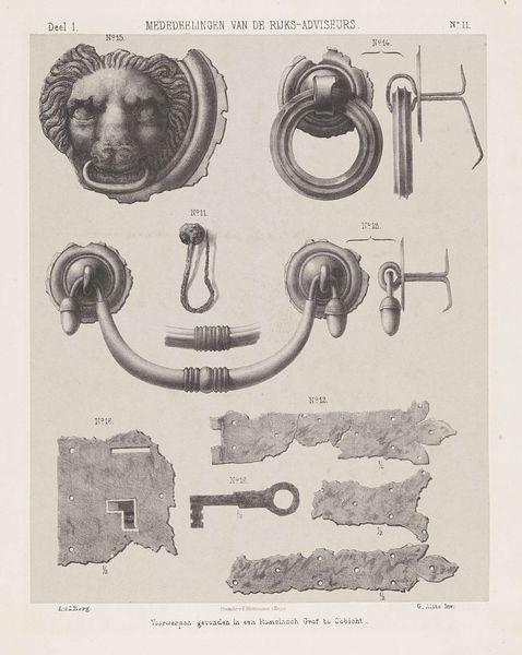 Julius Magnus-Petersen created this print, "Nordiske oldsager," to document Nordic antiquities. The arrangement presents these historical objects against a plain background, inviting us to examine their forms closely. The artist employs a limited palette, focusing on detailed linework to define each artifact. Notice how the light and shadow, rendered through delicate hatching, give the objects depth and volume. The composition avoids a strict grid, allowing each item to occupy its own space while maintaining an overall sense of balance. This approach reflects a scientific method, categorizing and preserving visual information about each artifact. Consider the careful precision with which Magnus-Petersen depicts the textures and shapes. The items are elevated not just as utilitarian objects but as cultural symbols worthy of close scrutiny and artistic representation. This print functions both as a record and an interpretation, inviting viewers to contemplate these fragments of the past.