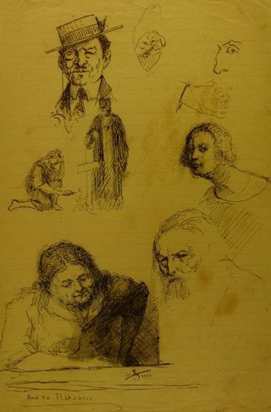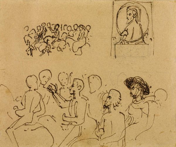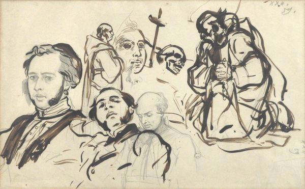 Curator: Well, this is fascinating! Before us, we have Eugène Delacroix's "Studies of Arab Heads and Figures," dating from after 1832. It’s a sheet filled with rapidly drawn sketches in pencil and watercolor. Honestly, it feels like we’re looking into Delacroix's personal sketchbook. What are your first thoughts? Editor: My first thought is pure visual anthropology, but with a palpable undercurrent of romantic fascination. The faces... they’re like fragments of stories. They feel so fleeting and yet each one pulses with a sort of self-contained energy. Like catching a glimpse of someone deeply engrossed in their own thoughts. Curator: That captures it beautifully. This was done after Delacroix’s trip to Morocco with the Comte de Mornay. It's important to remember the power dynamics at play; he was moving in elite circles and viewing another culture from that remove. "Orientalism," as it came to be called, was a lens through which many European artists viewed the East, tinged with preconceived notions. Editor: Absolutely, there’s that tightrope walk of capturing the "exotic" while teetering on the edge of cliché or misrepresentation. But Delacroix...he's not merely cataloging. There's this genuine attempt to grapple with something beyond the superficial. I sense an urgency, like he's chasing a feeling or an atmosphere. Did he have access to the people or do you think these faces came more from memory? Curator: It’s thought he did have models during that journey, but sketchbooks like this are where impressions solidify and are reshaped by memory. See how some of the faces are so lightly rendered they are almost ghost-like while others have bold lines and color wash? The range reveals the mind at work, constantly circling the subject. I see him searching to truly “see” something. The watercolors create such luminous skin tones. Editor: Exactly, those fleeting washes... the overall effect has a really wonderful sense of immediacy. It’s like peeking over the shoulder of a restless creative mind! In those individual glimpses you get hints of weariness, quiet dignity, introspection… and maybe it mirrors his self. Curator: Perhaps, but one must approach with caution when assuming likeness. Regardless, thank you, it is interesting to sit with art and share your initial thoughts in order to view the art differently! Editor: Always a pleasure, thank you as well! Now, if only all history lessons could be like this…