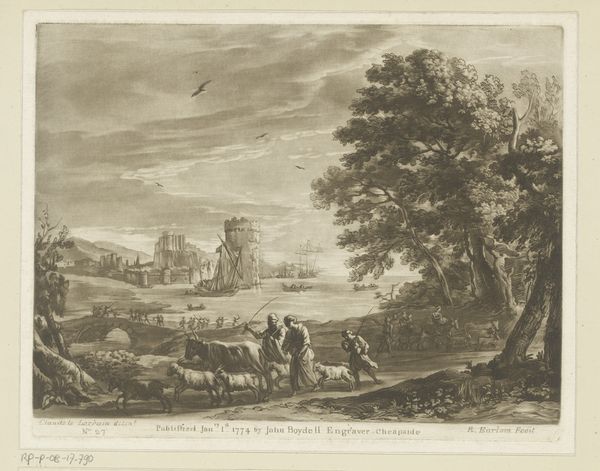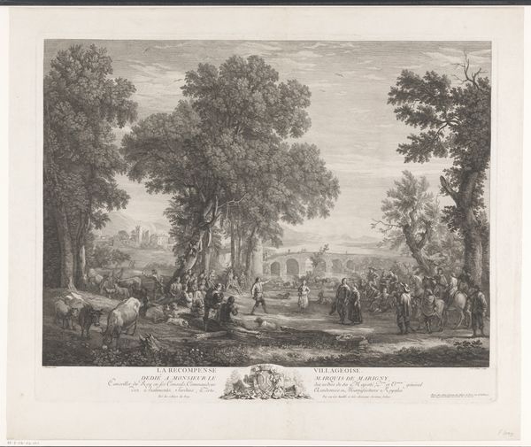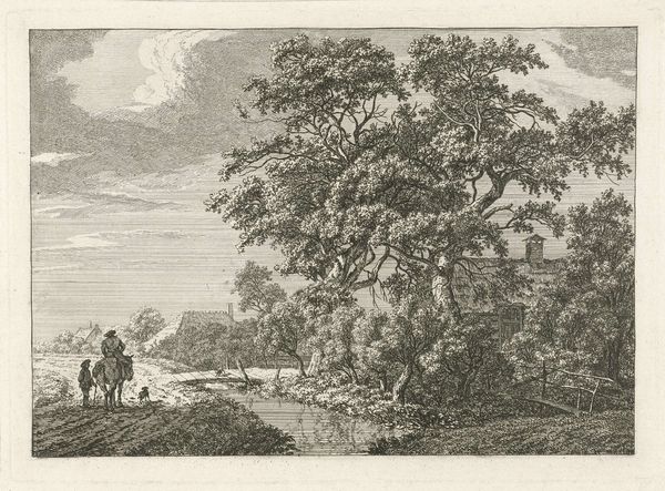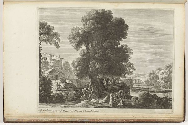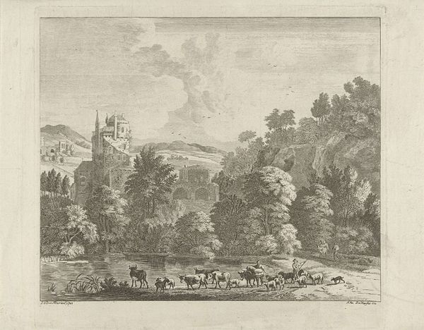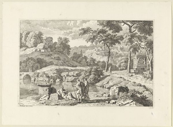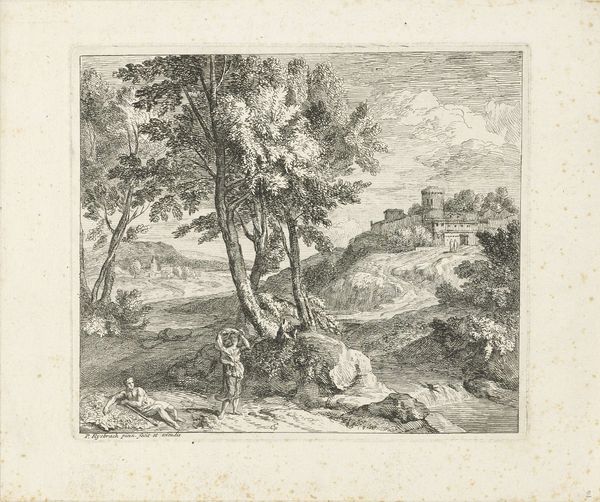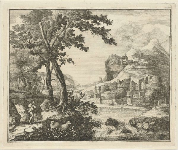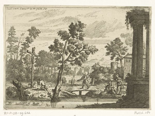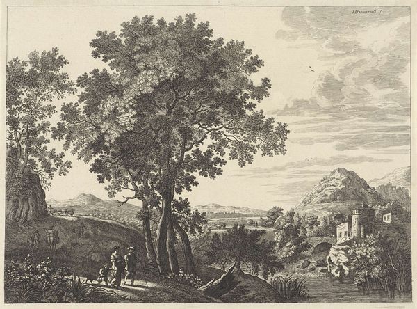 Curator: Looking at this engraving from around 1680-1695, "Landschap" by Nicolas Perelle, it strikes me how much human activity animates this seemingly placid rural scene. Editor: I see it, too! But initially, the engraving's crisp lines and contrasting dark and light values give it almost a stage-like, artificial feel. It is certainly pleasing, but removed from the toil of land cultivation that this "landscape" would imply. Curator: Yes, there's definitely a composed artificiality at play here, carefully constructed using an engraving technique. It speaks to a particular vision of the ideal landscape, circulating as a consumer good rather than direct experience. Perelle emphasizes production, and its dispersal throughout society in early modernity, highlighting its market context. Editor: Exactly! It's not just about the beauty of nature. This idealized image would circulate within elite circles. We have this scene depicting refined figures conversing near a possible well in the foreground juxtaposed with travelers in transit—the circulation of imagery mimics the circulation of bodies moving around the land itself! How are public spaces forming through printed representations? Curator: Note the ruins though. I'm curious how this emphasis affects our reading of this print? We need to explore how that process relates to this imagery being seen as ruins that also go through market economies. Editor: Right! Those ruins provide this potent commentary: landscape isn't fixed or pristine; it is marked by time and decay! Those marks speak to an unstable public memory that this artist manipulates through image reproduction. The print gives a glimpse into a very deliberate shaping of space through material culture. Curator: This has me rethinking the way it's laid out - all its deliberate material assembly - like a stage set waiting for the performance of class and the inevitable transformation of society itself. Editor: Agreed! It's a visually stimulating, complex piece. Nicolas Perelle, through the choice of subject and deliberate medium selection of print-making, provides social insights. Curator: Indeed. This landscape certainly offers much to consider from process to politics, showing just how much they're intertwined!