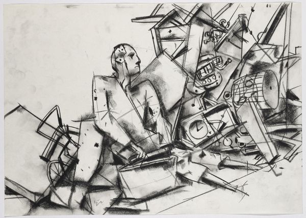 Curator: So, this is Erwin Spuler's "Untitled (As the Fire Fell From the Sky)," held here at the Harvard Art Museums. Editor: Wow, it feels like looking at chaos, a beautiful, terrifying jumble of sharp angles and dense charcoal. It's as if a city imploded on paper. Curator: The title is so evocative. It could be read as a response to the world wars, but perhaps it's more personal, a study of inner turmoil manifested in abstract form. Editor: Absolutely, the figure huddled amongst the debris gives it that human touch, like a survivor searching through the rubble. I keep wanting to find some sense of order, but maybe that's the point. Curator: Exactly. Post-war art grappled with disillusionment, and Spuler captures that raw emotion, that shattering of pre-war ideals. The lack of date makes it almost timeless, doesn’t it? Editor: It does. It really speaks to how chaos can be both destructive and, strangely, creatively fertile. It's unsettling, but I can't look away.