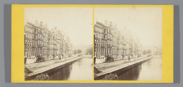 This subdued stereograph by Charles-Henri Plaut captures the Keizersgracht in Amsterdam. Made using an early photographic process, its muted tones and symmetrical composition invite us to consider the structured beauty of urban life. The photograph is divided by the canal, which acts as a mirror, doubling the architectural forms on either side. The repetitive pattern of the houses, punctuated by the vertical rhythm of trees, creates a sense of ordered space. The formal arrangement suggests a controlled environment where nature and architecture exist in balanced harmony. The canal itself functions as a negative space, emphasizing the solid forms of the buildings and trees. The overall effect is one of serene stability, characteristic of the structured environment of Amsterdam. This stereograph invites us to reflect on how early photography captured and framed the urban landscape, creating visual order. The image's formal qualities suggest the cultural values of the time.
