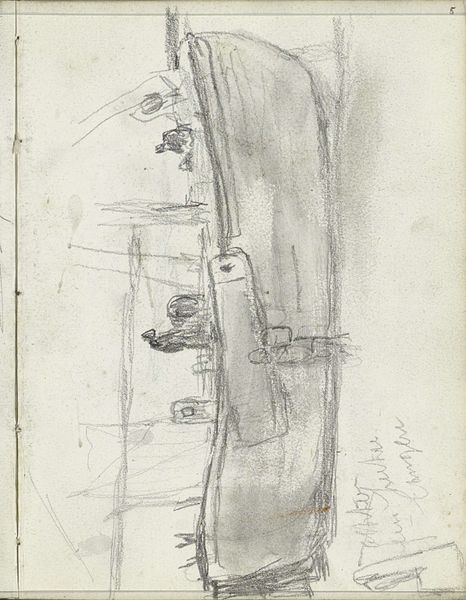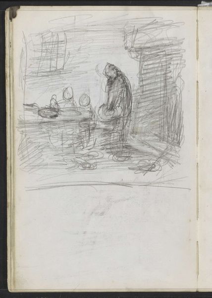 Editor: This is "Tafel onder een venster bij een deuropening," or "Table under a Window by a Doorway," a pencil drawing on paper by Jozef Israëls, from around 1855-1859. It feels so raw, almost unfinished, and I’m drawn to the stark simplicity of it. What's your take on this piece? Curator: Israëls’s drawing, created during the rise of realism, shows a clear move away from idealized scenes. He wasn't just depicting a table; he was depicting *life*, unvarnished. Notice the presence of labor implied by the objects on the table and, sketched lightly below, a group of figures who seem to be engaged in common work. This wasn’t art for the elite. Why do you think representing these ordinary scenes started to gain traction with the public? Editor: Perhaps it was a reflection of a shifting social consciousness, a recognition of the working class and their everyday struggles. Curator: Precisely! Artists began using art as a tool to represent those previously excluded, challenging the status quo of art and even politics. Consider how the distribution of such images, even simple drawings like this, might have contributed to the growing awareness of social realities outside the comfortable spheres of the wealthy. The window motif, quite common in Dutch Golden Age painting, might also imply a social and aesthetic looking outward. Editor: I see that now; it's like he's bringing the outside world, or rather, the world *within* closer to the viewer. I initially saw a simple drawing, but now I understand it carries so much socio-political meaning! Curator: Exactly! Israëls wasn't merely sketching; he was participating in a larger conversation about representation, class, and the power of imagery. The Rijksmuseum's acquisition of it reflects how perceptions of what deserves preservation, collection, and analysis, evolve over time. Editor: That really changes how I view art, not just as aesthetic objects, but as reflections of their time, influencing, and being influenced by, society. Thank you!
