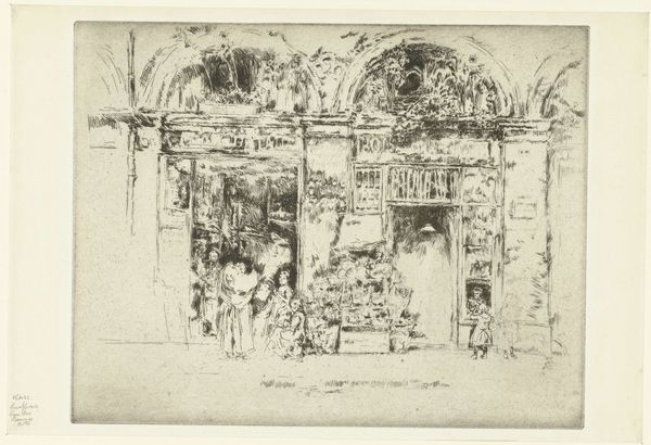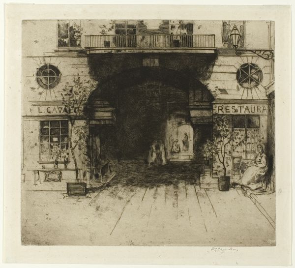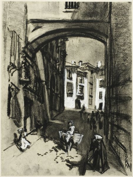 Curator: This is Joseph Pennell's "Toledo Streets," a print from around 1903, showcasing his distinctive cityscape style. Editor: There’s an immediate contrast in values that strikes me – stark blacks and radiant whites carve out these building facades with this dramatic and haunting effect. It almost feels staged. Curator: Pennell was deeply interested in how rapidly industrializing cities were changing. This print really captures the shifting urban landscape. Remember, this period witnessed massive shifts in wealth and power, impacting architectural styles and urban planning. Editor: It feels like more than just documentation. There’s an unease, a looming presence with those dark shadows that evokes questions around surveillance, exclusion, even oppression – especially when viewed in the light of the social strata of the time. Curator: Precisely. The architecture serves as a backdrop to explore themes of urban alienation, with the print emphasizing the isolating aspects of city life that emerged with modernization. The rapid growth of cities like Toledo forced individuals into more anonymous and often exploitative circumstances. Editor: I also keep considering those small architectural details above the doorways. The indecipherable writings on the wall are particularly evocative to me. Are they claiming ownership, religious statements, what exactly is going on in the shadows of Toledo society? Curator: Pennell often used prints to challenge existing social hierarchies, revealing the struggles of those marginalized by urban development and unchecked capital. In a way, Pennell acts as an early critic of gentrification, showcasing the displacement that shadows urban "progress." Editor: And the stark tonal divisions force a contemplation about how such sharp architectural divides often reflect societal inequalities – divisions that resonate today. Curator: Studying Pennell through an historical lens adds complexity to this image, doesn’t it? Editor: Yes, and considering it through the layers of urban theory amplifies it. Food for thought on our urban past, and, perhaps, present too.