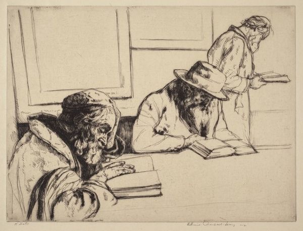 Alphonse Legros created this etching, "Account Book," using a metal plate and acid. The process of etching involves drawing an image into a waxy ground, then immersing the plate in acid, which bites into the exposed lines. This creates grooves that hold ink, which is then transferred to paper. The resulting image is characterized by fine, precise lines, capturing intricate detail. In this somber scene, the close examination of finances speaks to Legros's interest in depicting the lives of the working class. The stark, linear quality of the etching emphasizes the weight and seriousness of their task, hinting at the labor involved in earning a living. The act of carefully tracking finances becomes a symbol of their daily struggles and resilience. By elevating this ordinary scene through the skilled craft of etching, Legros challenges traditional distinctions between fine art and everyday life, reminding us of the dignity and significance found in the most humble of circumstances.