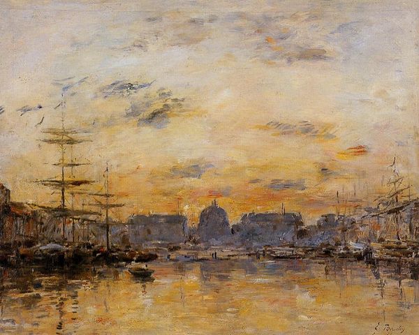 Editor: This is Camille Pissarro’s “Quay in Rouen Sunset,” painted in 1896 using oil paints. I’m struck by how the golden light transforms the industrial port into something almost dreamlike. How do you interpret this work, considering its place in art history? Curator: Well, let’s think about what Pissarro, as a Post-Impressionist, was responding to. Impressionism had already challenged academic painting, but Pissarro, along with others like Seurat and Cézanne, wanted to push further. He painted several views of Rouen. What does it say about Pissarro as an artist, do you think, to select an industrial setting like this quay as his subject matter? Editor: It seems like he's elevating the everyday, finding beauty in a working port rather than an idealized landscape. Was this a common theme in the late 19th century? Curator: Precisely! The late 19th century was a time of massive industrial expansion and urbanization. Artists were grappling with these changes, questioning what was worthy of being depicted. This quay, with its bustling activity and the visual drama of the steam and the light, represents the modern experience. Pissarro wasn't just painting what he saw, but participating in a dialogue about the changing world and how art should reflect it. Look at how the light reflects on the water – is it a natural depiction, or does it symbolize change? Editor: That makes sense. So, it's not just a pretty picture, it’s a commentary on industrial society. I hadn't thought about the socio-political context so deeply. Curator: Exactly. By choosing this subject and depicting it with such sensitivity, Pissarro is acknowledging the social and economic realities of his time, while still seeking beauty within it. It’s a radical act, in a way. Do you think he's glorifying industry or just observing? Editor: Perhaps he is just an observer, documenting and allowing the viewers to form their own opinions. I appreciate seeing this painting in a new light! Curator: It's fascinating how understanding the historical context can deepen our appreciation of a piece of art. I found our chat valuable, I was making assumptions about the work, without taking the setting of the painting into consideration.