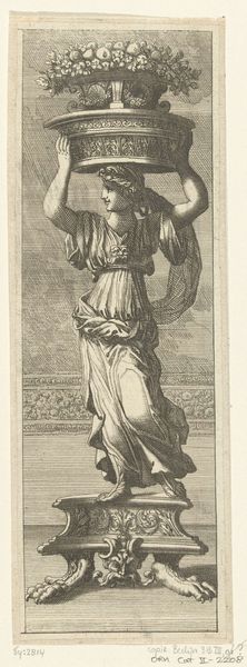 This engraving, "Experientia," was created by Philips Galle in the late 16th century. The print depicts an allegorical female figure, likely representing experience, rendered with meticulous detail. The composition presents a full-length portrait against a neutrally etched background, typical of the era's graphic style. Galle's use of line is paramount. Notice how varying densities and directions create texture and form, defining the folds of the figure's garments and the contours of her body. The lines serve not only to illustrate but also to imbue the figure with a sense of weight and presence. Observe too how the figure holds a plumb bob, a symbol of measurement and precision, thus visually encoding the idea of knowledge gained through practical experience. The image itself is a study in contrasts: youth and decay, the material and the abstract. It asks us to consider how visual codes create meaning and how these meanings might reflect the cultural values of the time.