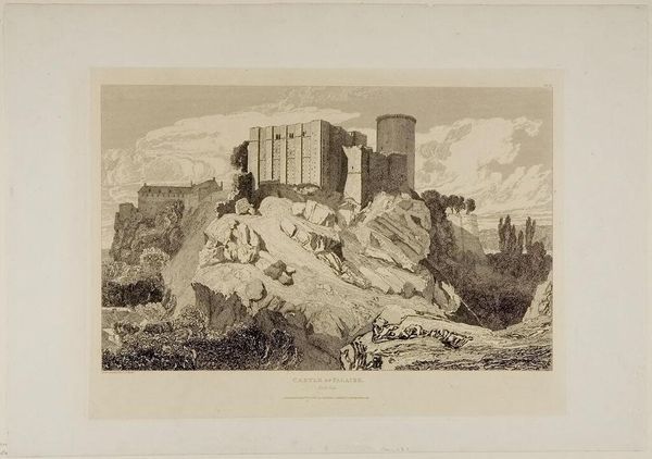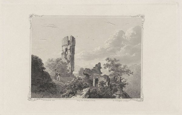 Curator: This is Johann Christian Reinhart's "Ancient Tomb in Via Nomentana," a stark etching of a Roman ruin overtaken by nature. It's at the Harvard Art Museums. Editor: It’s melancholic, isn’t it? The tomb feels haunted, not just by history, but by the ghosts of power imbalances that civilizations build upon. Curator: Absolutely. Reinhart captures that romantic desolation so well. Look how the structure crumbles, yet stubbornly stands. It makes you wonder about who gets remembered, and why. Editor: And the pastoral scene playing out around it. The shepherd, the animals… it's almost mocking in its obliviousness to the grandeur that once was, which is the point, isn't it? Erasure isn't passive. Curator: Yes, I think Reinhart is inviting us to confront that erasure, to consider how time and nature reshape even the most imposing structures, physically and symbolically. Editor: Ultimately, this image makes me question our own monuments, both physical and ideological, and who they truly serve. It’s a powerful meditation on impermanence. Curator: Indeed, a memento mori etched in ink, reminding us that nothing, however grand, lasts forever.