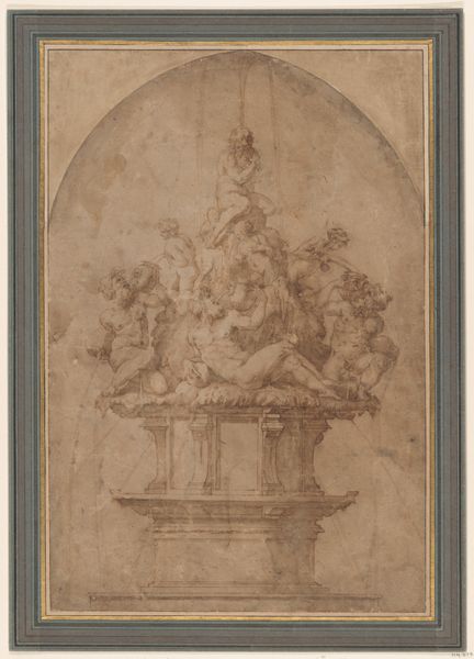 Curator: What strikes you first about this sketch? The Metropolitan Museum holds this drawing titled "Design for a Wall Tomb or Monument" with a "Smaller Variant Version with Half Length Madonna & Child on Crescent Moon" on its back, made by Giovanni Francesco Penni around 1516. Editor: Its austere nature. A drawing for a tomb, yet seemingly so devoid of flourish. The economic conditions must have dictated quite limited materiality. Curator: Limited perhaps only by the medium used for the study, a print with pen and brown ink on paper. Note, however, how Penni integrates Christian imagery of the Madonna and Child. It reflects not only his training in Raphael’s workshop, but the persistent motifs in funerary art. Mary, as the Theotokos, signifies promise and renewal. Editor: You speak of the promise of "renewal" and the visual, however I focus on the design: look at the inscription ‘D.O.M.’ – Deo Optimo Maximo – and the rods for possible lamps. I wonder about the expense, in both materials and labor. Curator: A Renaissance preoccupation, certainly. I observe the Madonna is centrally positioned, but is not a figure of intense grief. This image differs greatly to others from this period. Perhaps the individual who was to be entombed was not an individual of prominence or royalty, therefore religious aspects took centre stage. Editor: The scale appears modest too, which confirms my initial instinct: less ornate means cheaper. Curator: Agreed, but also potentially signifies humility. By presenting a figure, centrally and symbolically, as the epitome of forgiveness and new beginnings perhaps Penni elevates her status within the monument, offering solace and perhaps the prospect of transcendence in a world that had become dominated by greed and avarice. Editor: An interesting counterpoint between sacred intent, artistic value, and material production all existing on the same plane. Curator: Indeed. It's an illustration of human experience that encapsulates a very transitional time.