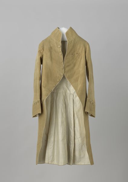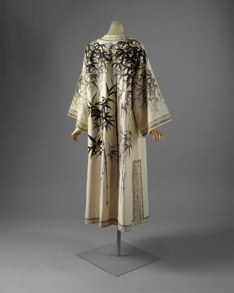Editor: Here we have an "Evening Coat," a textile piece dating back to the late 1890s, residing here at the Met. Its neutral tones and detailed embellishments evoke such a poised, sophisticated ambiance. What captures your attention most about this garment? Curator: Oh, absolutely! It’s more than just a coat, isn't it? It's like wearable poetry. For me, it’s the whisper of a bygone era. Imagine a woman draped in this, stepping out into a gaslit street – it speaks of secret liaisons and whispered conversations, wouldn't you say? And the art nouveau detailing cascading down...like liquid moonlight. It's both bold and incredibly delicate. It is very chic even now! Does the artistry pull you into its charm as well? Editor: It absolutely does! It feels so luxurious, but also structured with a modern flair. All that meticulous beadwork must have taken incredible skill and time. Curator: Exactly! That era, it wasn’t about mass production. Everything was so intensely personal. Each bead is a tiny brushstroke, telling its story. Editor: Do you think its possible that each bead was specially produced? Curator: That's entirely possible! It was an age that took such pride in even the smallest detail of production. Everything was a display of quality and pride! This coat bridges practicality and a desire to carry an elaborate symbol around, doesn't it? How interesting to balance both, now that I look at it... Editor: I never considered the practicality of it, but it does look cozy! This conversation really altered my view. Curator: Yes! That blend... the delicious paradox between adornment and function. So, perhaps it can be about carrying ourselves with intention... That, and not catching a cold on the way to the opera!