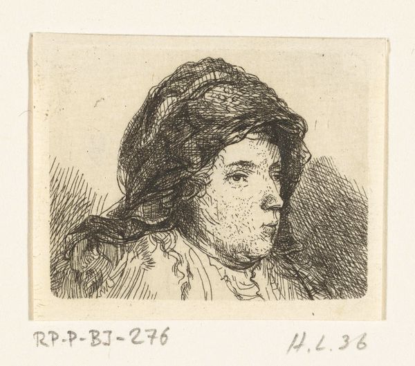 Curator: Here we have a small etching entitled "Portretbuste van een vrouw met doek om haar hoofd," or "Portrait Bust of a Woman with a Cloth Around Her Head." It was created by Ernst Willem Jan Bagelaar sometime between 1798 and 1837. Editor: The image is haunting; the figure’s gaze avoids yours, cast downward and to the side. The detail of the etching makes her almost seem like a ghost. Curator: Bagelaar was working during a time of massive social upheaval, as traditional structures were beginning to break down across Europe. I see echoes of Neoclassical portraiture here, with its emphasis on the individual, but the scale feels much more intimate. Editor: The cross-hatching really emphasizes the texture of the fabric wrapped around her head. You can almost feel the rough weave of the cloth. It's interesting how an inexpensive, easily reproducible material like an etching can carry such tactile qualities. It speaks to the democratization of art making and how an everyday experience could be brought to a broader audience through prints. Curator: Certainly, the reproducibility of etching was becoming increasingly significant. Think about how printed images started circulating revolutionary ideas at this time! Bagelaar’s portrait may be of an ordinary woman. Prints could depict, and thereby valorize, ordinary people. Editor: Absolutely, but there's also a potential flattening of lived experience. Mass production has always had a relationship to disposability. How might Bagelaar's work navigate those issues of labor and class in his era? Curator: Perhaps Bagelaar sought to capture her individuality with this attention to line, an antidote to disposability, as you say. The fine hatching speaks to that care. Editor: I think looking closely at the choices made, from the plate preparation to the pressure of the press, gives us a connection to the people behind the work, and therefore, to the subjects depicted within. It opens a way to see how these art objects can function, communicate, and mean across time.