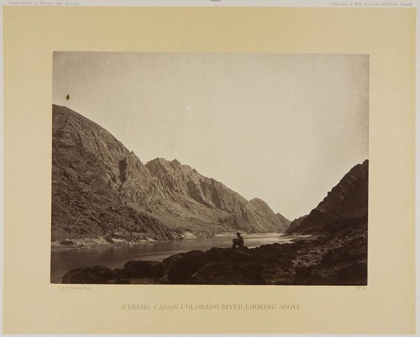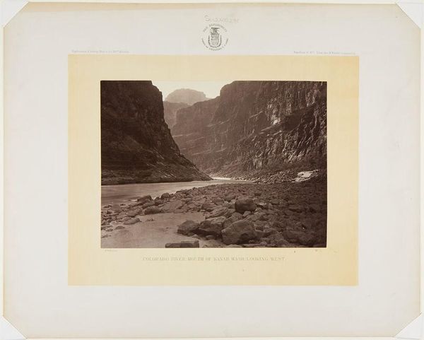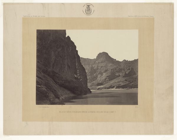 Curator: Timothy O’Sullivan’s photograph, "Entrance to Black Canon, Colorado River," presents a stark landscape. It’s a study in geological power and the American West. Editor: The photograph evokes a sense of isolation. There is a subtle feeling of dread—the landscape is so barren and monumental. Curator: O’Sullivan worked for the U.S. Geological Exploration teams, documenting the terrain. His images were crucial in shaping perceptions and policies around westward expansion. Editor: The image is very sepia, a visual symbol of memory. The river, so still, mirrors the permanence of stone. It is archetypal, a reminder of nature's indifference. Curator: He was documenting what was there. But such documentation inevitably influences land management and resource extraction policies. It is hard to see the picture outside that context. Editor: Perhaps it's that very tension between the stark beauty and the looming sense of exploitation that makes the photograph so haunting. Curator: Precisely. It reflects a complex historical moment. Editor: Yes, a moment where hope and foreboding intertwine in the face of the sublime.